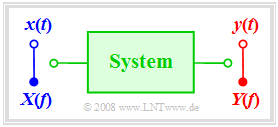 Wir betrachten im Folgenden ein System, an dessen Eingang das Signal $x(t)$ mit zugehörigem Spektrum $X(f)$ anliegt. Das Ausgangssignal bezeichnen wir mit $y(t)$ und dessen Spektrum mit $Y(f).$