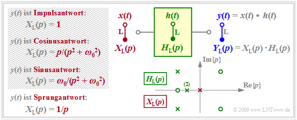 - Verwendet man das Eingangssignal $x(t) = δ(t)$ ⇒ $ X_{\rm L}(p) = 1 $ ⇒ $ Y_{\rm L}(p) = H_{\rm L}(p)$, so beschreibt $y(t)$ die Impulsantwort $h(t)$ des Übertragungssystems. Zur Berechnung dürfen hierfür nur die in der Grafik grün eingezeichneten Singularitäten herangezogen werden.