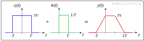 $\text{Beispiel 3:}$ Am Eingang eines Tiefpasses mit rechteckförmiger Impulsantwort $h(t)$ der Breite $T$ (siehe $\text{Beispiel 1)}$ liegt ein Rechteckimpuls $x(t)$ der Dauer $2T$.