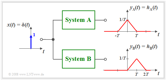 - Beim System $\rm A$ beginnt die Wirkung früher $($bei $t =\hspace{0.05cm} –T)$ als die Ursache $($Diracfunktion bei $t = 0)$, was natürlich in der Praxis nicht möglich ist.