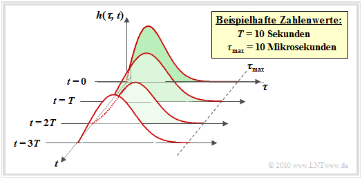 - Die LZV–Gleichung ist nur anwendbar, wenn die zeitliche Veränderung des Kanals $($im Bild durch den Parameter $T$ gekennzeichnet$)$ langsam erfolgt im Vergleich zur maximalen Verzögerung $\tau_{\rm max}$. Im Mobilfunk ist diese Bedingung ⇒ $\tau_{\rm max} < T$ fast immer erfüllt.