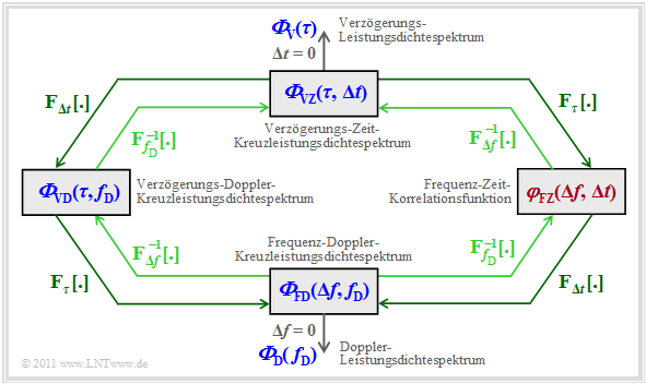 - \[{\it \Phi}_{\rm VZ}(\tau, \Delta t) \hspace{0.2cm} \stackrel{\tau, \hspace{0.05cm}\Delta f}{\circ\!\!-\!\!\!-\!\!\!-\!\!\bullet} \hspace{0.2cm} \varphi_{\rm FZ}(\Delta f, \hspace{0.05cm}\Delta t) \hspace{0.2cm} \stackrel{\Delta t,\hspace{0.05cm} f_{\rm D}}{\circ\!\!-\!\!\!-\!\!\!-\!\!\bullet} \hspace{0.2cm} {\it \Phi}_{\rm FD}(\Delta f,\hspace{0.05cm} f_{\rm D}) \hspace{0.05cm}.\]