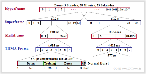 Durch die GSM–Rahmenstruktur erfolgt die Abbildung der logischen Kanäle auf physikalische Kanäle. Hier beschränken wir uns auf Verkehrskanäle und auf die Abbildung in der Zeit. In diesem Fall wird jeder Multiframe von $120 \ \rm ms$ Dauer in $26$ TDMA–Rahmen (davon zwei für Kontrollkanäle) der Dauer $4.615\ \rm ms$ unterteilt. Damit ergibt sich für die Dauer eines Zeitschlitzes näherungsweise $T_{\rm Z} = 576.9\ \rm µ s$.