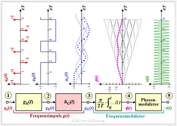 - Würde man auf den Gaußtiefpass mit der Impulsantwort $h_{\rm G}(t)$ verzichten ⇒ $q_{\rm G}(t) = q_{\rm R}(t)$, so ergäbe sich am Punkt $(4)$ eine abschnittsweise lineare Phasenfunktion $\phi(t)$. Bei Vielfachen der Symboldauer $T$ wären damit alle Phasenwerte Vielfache von $π/2$.