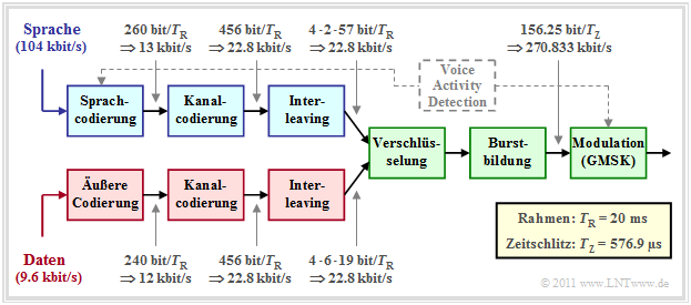 Betrachten wir zunächst die $\rm GSM–Sprachübertragung$, also den oberen Zweig der Grafik: