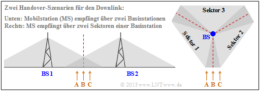- Softer Handover: Eine Basisstation ("Node B") empfängt das Signal eines Teilnehmers über zwei Sektoren und macht "Soft Combining". Es gibt einen Diversitätsgewinn sowie einen Kohärenzgewinn von $\text{3 dB}$.