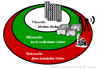 Im UMTS–Netz $(f_{\rm T} \approx 2 \ \rm GHz)$ gibt es verschiedene Typen von Funkzellen: