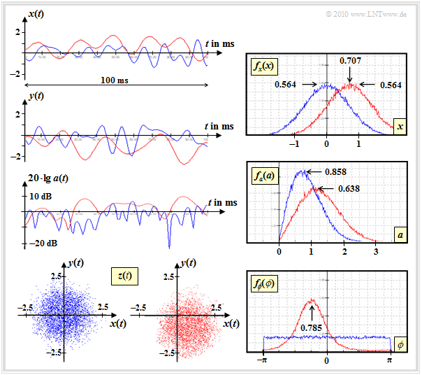 • Die Realteile  $x(t)$  von Rayleigh (blau) und Rice (rot) unterscheiden sich durch die Konstante  $x_0 = 0.707$.  Die statistischen Eigenschaften sind ansonsten gleich:   Gaußsche WDF  $f_x(x)$  mit Streuung  $\sigma = 0.707$, entweder mittelwertfrei (Rayleigh) oder mit Mittelwert  $x_0$  (Rice).