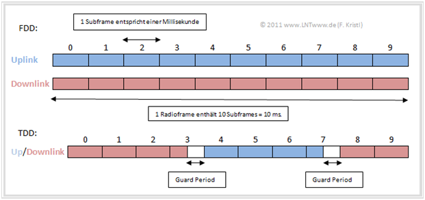 Mit Hilfe der Methoden FDD und TDD kann also LTE sowohl in gepaarten, als auch in ungepaarten Frequenzbereichen betrieben werden. In der Grafik sind die Unterschiede zwischen FDD und TDD zu erkennen. Man sieht, dass man bei TDD beim Wechsel von Downlink zu Uplink (bzw. umgekehrt) eine "Guard Period" einfügen muss, damit es nicht zu einer Überlagerung der Signale kommt.