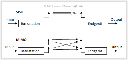 Verwendet ein Funksystem mehrere Sende– und Empfangsantennen, so spricht man von "Multiple Input Multiple Output" $\rm (MIMO)$. Dabei handelt es sich nicht um eine LTE–spezifische Entwicklung. So nutzt beispielweise auch WLAN diese Technologie.