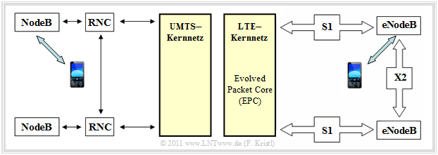 - In UMTS–Netzen (linke Grafik) ist zwischen einer Basisstation (NodeB) und dem Kernnetz noch der "Radio Network Controller" (RNC) zwischengeschaltet, der für den Wechsel zwischen verschiedenen Zellen hauptverantwortlich ist und der zu Latenzzeiten von bis zu 100 Millisekunden führen kann.