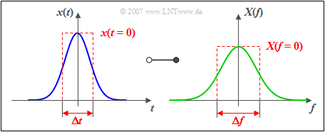 $\text{Beispiel 4:}$  Die Grafik verdeutlicht die äquivalente Impulsdauer  $\Delta t$  und die äquivalente Bandbreite  $\Delta f$  beispielhaft für den Gaußimpuls. Weiter gilt: