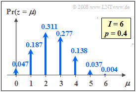 $$p_\mu = {\rm Pr}(z=\mu)={I \choose \mu}\cdot p\hspace{0.05cm}^\mu\cdot ({\rm 1}-p)\hspace{0.05cm}^{I-\mu}.$$