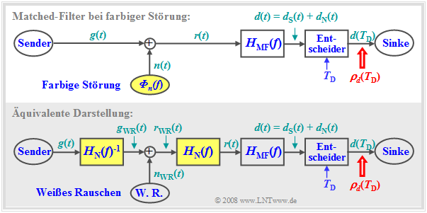 Anhand dieses modifizierten Modells wird nun das Matched–Filter für den Fall farbiger Störungen hergeleitet. Besitzt $H_{\rm N}(f)$ keine Nullstelle, was für das Folgende vorausgesetzt werden soll, so ist diese Anordnungen mit dem obigen Blockschaltbild identisch.