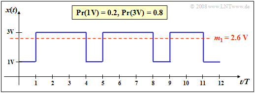 $\text{Beispiel 1:}$ Ein Binärsignal $x(t)$ mit den beiden möglichen Amplitudenwerten