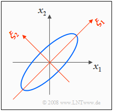 In der Grafik ist zusätzlich das $(ξ_1, ξ_2)$-Koordinatensystem eingezeichnet, das durch die Eigenvektoren $\mathbf{ξ}_1$ und $\mathbf{ξ}_2$ der Korrelationsmatrix aufgespannt wird: