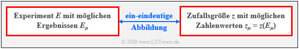 - Eine Zufallsgröße $z$ ist eine ein-eindeutige Abbildung der Ergebnismenge $\{E_μ \}$ auf die Menge der reellen Zahlen.