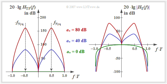- $$a_{\star} = 80\,{\rm dB}\hspace{-0.1cm}:\hspace{0.2cm}{\rm Max}[H_{\rm TF}(f)] \approx 160\,{\rm dB}, \hspace{0.2cm}{\rm Max}[\ |H_{\rm E}(f)|\ ] \approx 80\,{\rm dB}\hspace{0.05cm}.$$