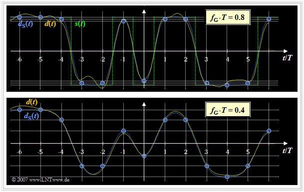 - Der Rauschanteil $d_{\rm N}(t)$ – erkennbar als Differenz zwischen der gelben Kurve und den blauen Kreisen – ist mit $f_{\rm G} \cdot T = 0.8$ im statistischen Mittel größer als mit $f_{\rm G} \cdot T = 0.4$.