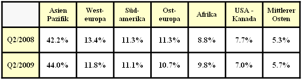 - Der relative Marktanteil von Westeuropa ist von 13.4% (2008) auf 11.8% (2009) gesunken, obwohl die absolute Zahl von 493 Millionen auf 510 Millionen gestiegen ist. Die gleiche Tendenz lässt sich auch bei anderen „Erste–Welt–Regionen” wie USA/Kanada ablesen.