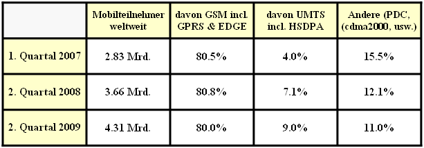 - Der GSM–Anteil lag zwischen 2006 und 2009 stabil bei etwa 80%. Der UMTS–Anteil (inkl. HSDPA) stieg von 2007 bis 2009 von 4% auf 9%, im wesentlichen auf Kosten des japanischen „PDC” und des amerikanischen Systems „cdma2000”.