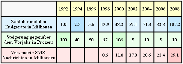 - Eine ganz besondere Erfolgsgeschichte war die Einführung der Kurzmitteilungen (englisch: Short Message Services, SMS). Beispielsweise wurden 2008 in deutschen Mobilfunknetzen fast 30 Milliarden solcher Kurznachrichten verschickt (dunklere Hinterlegung in Zeile 4).