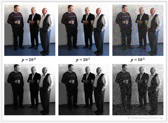 Die folgende Bilderserie zeigt den Einfluss von statistisch unabhängigen Fehlern (BSC–Modell) mit folgenden (Bit–)Fehlerwahrscheinlichkeiten: