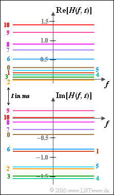 - Wie schon aus obiger Grafik zu erahnen ist, sind weder der Realteil noch der Imaginärteil der 2D–Übertragungsfunktion $H(f,\ t)$ mittelwertfrei.