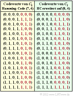 Codetabellen des  $(7, 4, 3)$–Hamming–Codes und der  $(8, 4, 4)$–Erweiterung